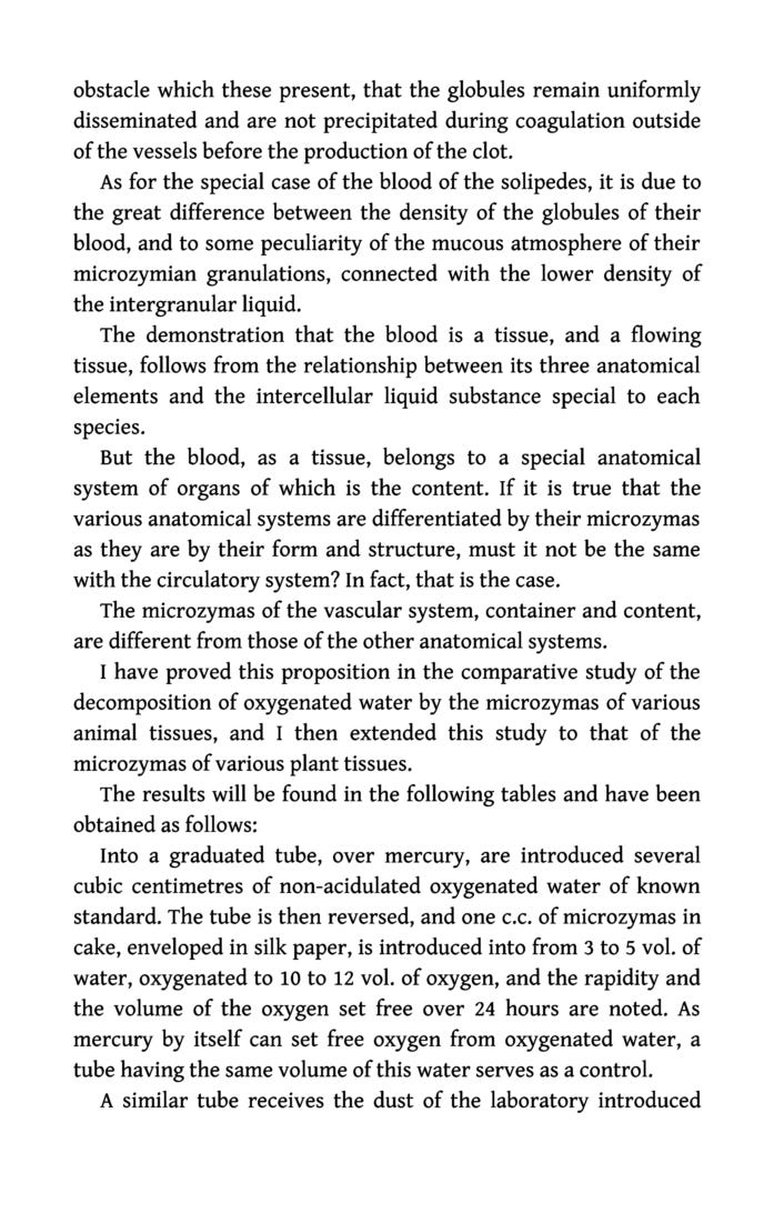 To appreciate the antinomy between the microbian system and the microzymian theory, and to give to this work its practical utility by showing that the microzymian theory explains what the microbian system is powerless to make clear, it will be sufficient to recall the two fundamental facts upon which rest the fabric of the demonstration that the blood is a flowing tissue, and like all tissues, is spontaneously alterable.