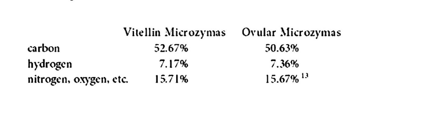 So much, then, for the anatomical analysis of the egg of the fowl. Chemical analysis shows that the elementary composition of the ovular microzymas is not the same as that of the vitellin, the former, as will be seen, being less carbonized. Evidently, their composition changed in the process of multiplication.’
