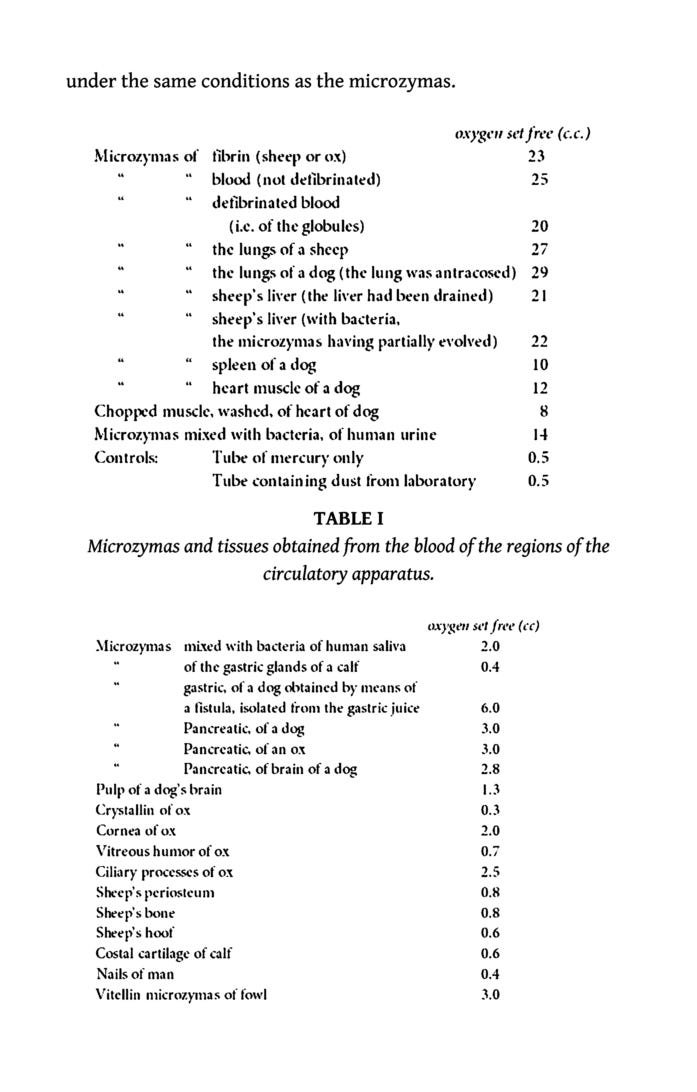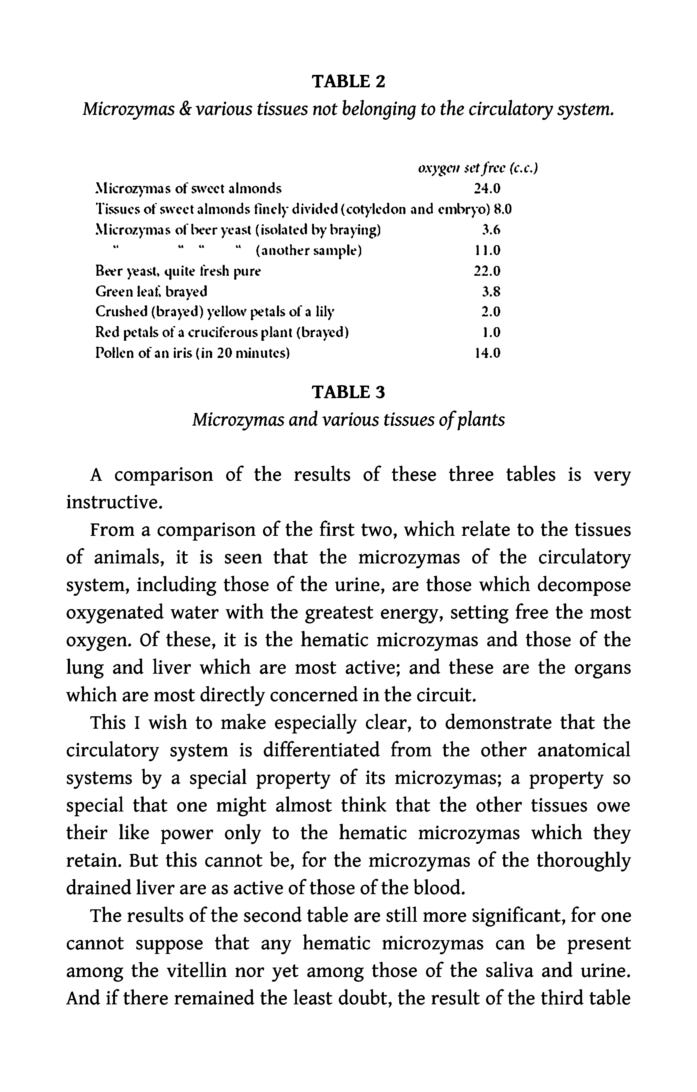 The microzymas of the vascular system differ from the microzymas of the other anatomical systems with regard to their power of decomposing oxygenated water. This is also to be seen from the above mentioned observations of Thénard when correctly interpreted. These differences are seen to be still greater when we study comparatively the physiological functional aptitudes of the various anatomical systems in man and other animals.