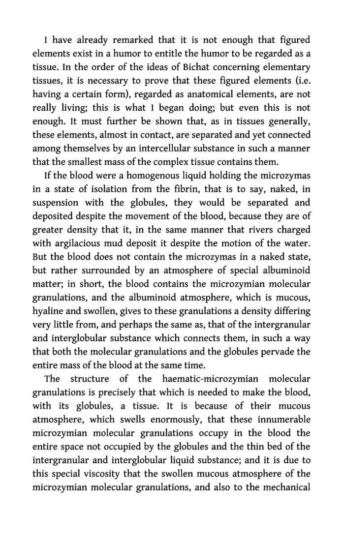 And now I hope it will be confessed that the error, common to all contemporary experimenters who have sought to discover the cause of the phenomenon of the spontaneous coagulation of the blood, and also the cause of other equally spontaneous alterations, or who, like Pasteur, maintain the natural inalterability of the blood and of all natural organic matters, is that they have regarded protoplasm as a mixture of pure proximate principles, and have held as dogma that this mixture is living and organized, although not morphologically constituted. At last I hope that it will be recognized that the discovery of the microzymas verifies the time honored conception of Bichat, according to which only that which is structured and morphologically determinate in any organism is living.